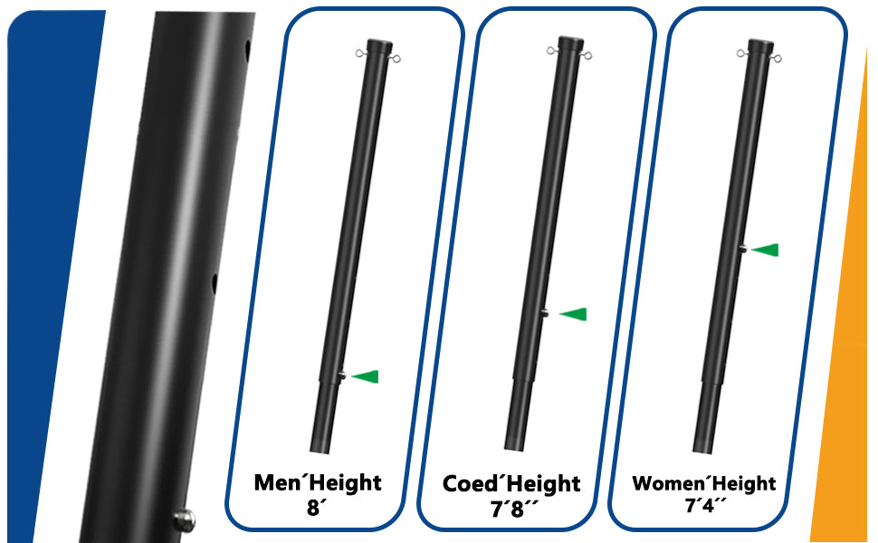 Volleyball net set using high-strength aluminum pole manufacturing, frosted surface spraying treatment, and the use of 3-stage design, the overall lightweight at the same time, the structure is also more stable, adjustable volleyball net height support 3-speed adjustment (Men's Height 8', COED Height 7'8", Women's Height 7'4"), suitable for a variety of sports scenarios